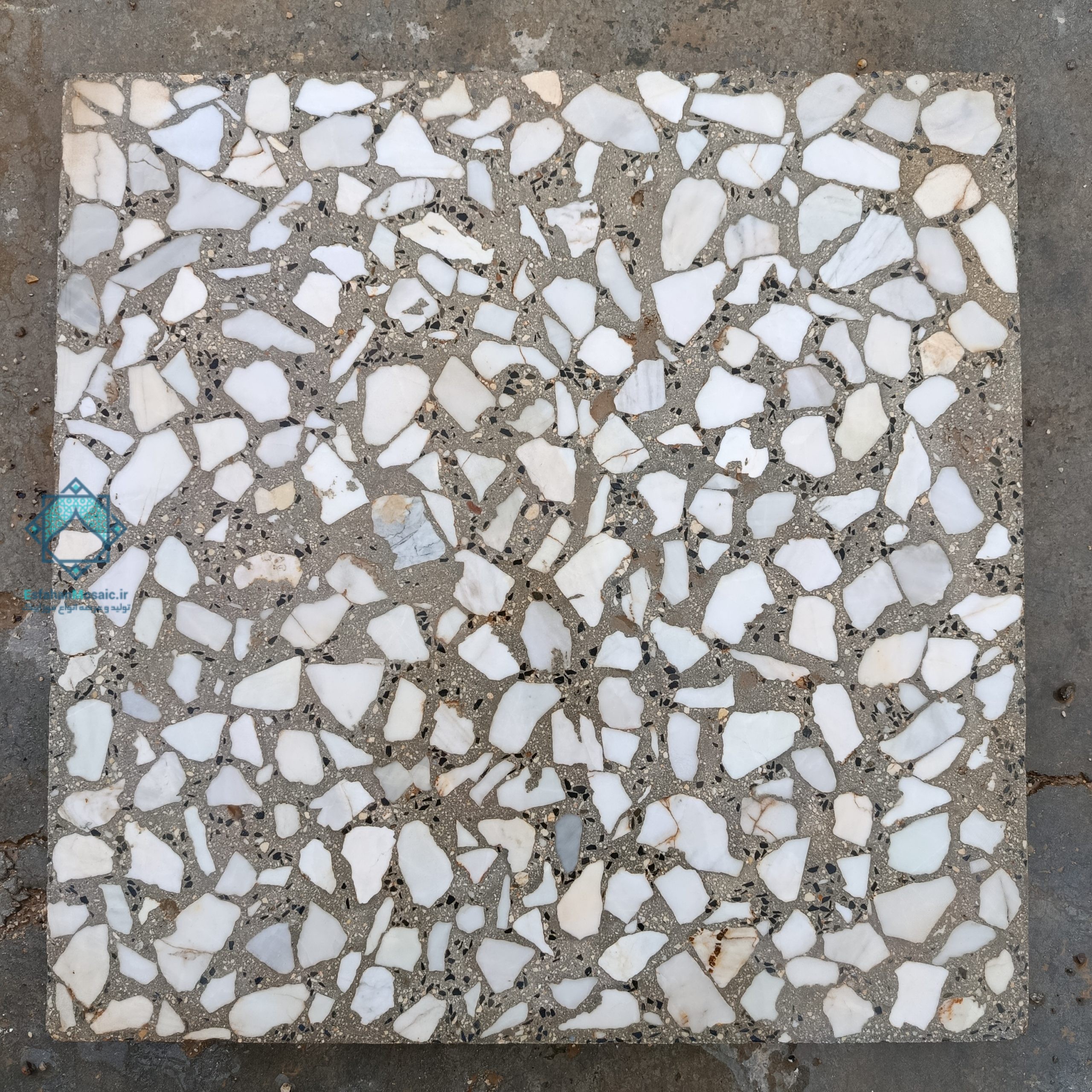 در فرآیند خرید موزاییک خشخاشی نمره 4 باید بدانید که این محصول با زمینه سیمان سیاه تولید میشود و ترکیبی از سنگهای سفید چینی الیگودرز نمره 4 و سنگریزههای مشکی دارد. این ترکیب رنگی باعث شده زمینه موزاییک نیمهتیره باشد و آلودگی، گرد و خاک و لکهها کمتر روی آن نمایان شود؛ موضوعی که برای فضاهای صنعتی و پارکینگ اهمیت زیادی دارد.